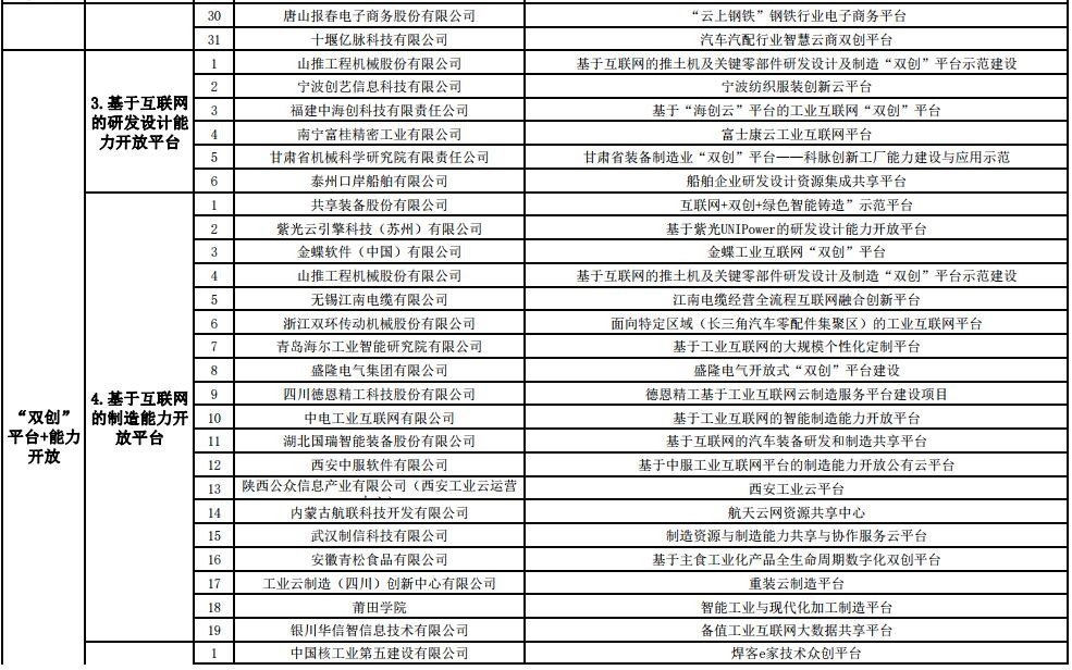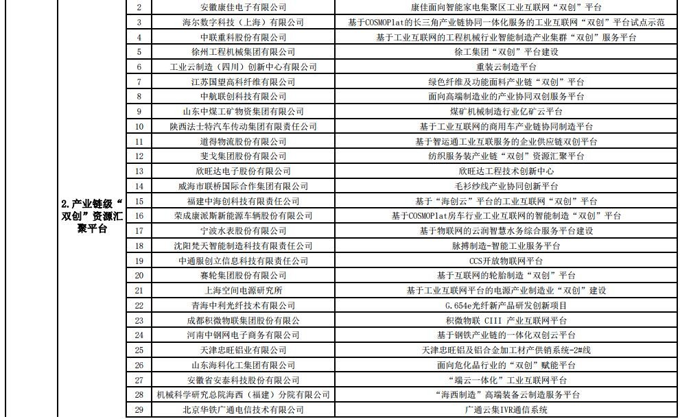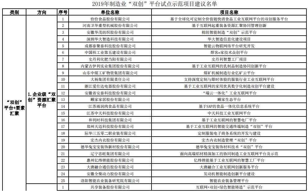 為深入貫徹《國務(wù)院關(guān)于深化制造業(yè)與互聯(lián)網(wǎng)融合發(fā)展的指導意見》(國發(fā)〔2016〕28號),結(jié)合《工業(yè)和信息化部辦公廳關(guān)于組織開展2019年制造業(yè)“雙創(chuàng)”平臺試點示范項目申報工作的通知》(工信廳信軟函〔2018〕146號),經(jīng)企業(yè)自主申報、地方推薦和專家評審,工業(yè)和信息化部擬將基于全球化可定制全價值鏈快消食品工業(yè)互聯(lián)網(wǎng)平臺的雙創(chuàng)服務(wù)平臺等137個項目核定為2019年制造業(yè)“雙創(chuàng)”平臺試點示范項目(以下簡稱“試點示范項目”)。現(xiàn)對試點示范項目名單進行公示(見附件),歡迎社會各界監(jiān)督。如有異議,請在公示期內(nèi)與工業(yè)和信息化部信息化和軟件服務(wù)業(yè)司聯(lián)系。
