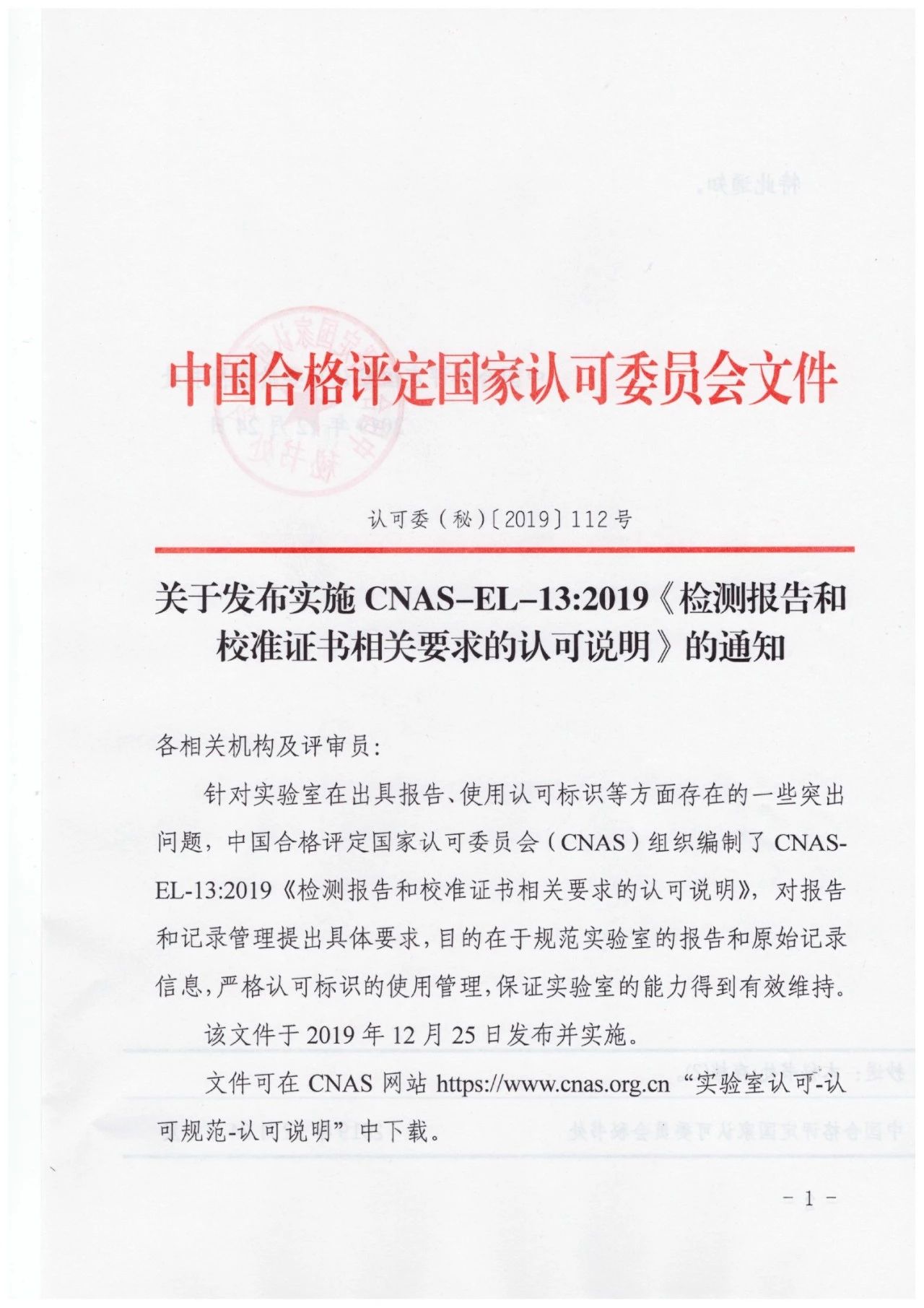 關于發布實施CNAS-EL-13:2019《檢測報告和校準證書相關要求的認可說明》的通知