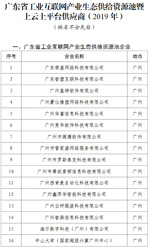 為推動制造業數字化、網絡化、智能化轉型升級,不斷發展壯大廣東工業互聯網產業生態體系,根據《廣東省工業和信息化廳辦公室關于組織申報廣東省工業互聯網產業生態供給資源池暨上云上平臺供應商(2019年)的通知》(粵工信辦函〔2019〕30號)和《廣東省工業和信息化廳關于印發廣東省工業企業上云上平臺服務券獎補工作方案(2019)的通知》(粵工信工業互聯網函〔2019〕1553號)文件要求,我廳先后組織開展了2019年第一、二、三批廣東省工業互聯網產業生態供給資源池暨上云上平臺供應商的申報和遴選工作。經企業申報、專家評審和網上公示,現予以公布。