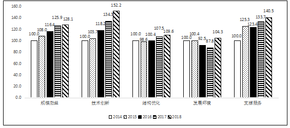 其中,一級指標中技術創新指數與發展環境指數提升最快,分別達到152.2和104.3,上升幅度為17.9個和16.5個分值,對全國綜合發展指數上升的貢獻率達52.6%和23.3%,拉動作用突出,其他三個指標也實現穩步提升(見表1)。