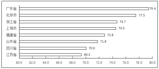 本年領先省份綜合發展指數均值為73.8,比上年上升2.5個分值,技術創新指數增長突出,廣東省綜合得分最高;中間省份綜合發展指數均值73.5,比上年上升3.4個分值,規模發展指數增長較快,安徽省綜合得分最高;潛力省份綜合發展指數均值65.0,發展環境指數增幅相對較快,山西省綜合得分最高;重點城市綜合發展指數均值69.0,比上年提高0.8個分值,支撐服務指數增幅突出,深圳市綜合得分最高。