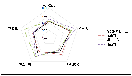 三是潛力省份產業發展環境持續優化,跨越式發展進程加快。潛力省份綜合發展指數均值65.0,其中發展環境指數增幅相對較快,比上年提高0.7個分值。黑龍江省發展環境指數居首位,比潛力省份平均水平高5.6個分值,相繼出臺產業促進政策,持續推進落實鼓勵軟件業發展的相關政策,全年軟件企業享受優惠政策已退稅額占應交稅額比重為22.4%,比上年提高6.1個百分點,高于潛力省份平均水平13.3個百分點。山西省綜合發展指數最高,為67.6,其中技術創新指數優勢突出,高出潛力省份平均水平8.5個分值,全年研發強度達9.7%,比上年提高0.5個百分點,企均軟件著作權數量居于潛力省份首位。云南省、寧夏回族自治區結構優化指數居于前列,云南省作為潛力省份中唯一有軟件百家企業的省市,大企業帶動作用凸顯,軟件百家企業收入占比高達22.0%;寧夏回族自治區緊抓“一帶一路”發展機遇,加快推動中衛云基地建設進程,促進產業轉型升級,全年云化運營收入占比高達21.4%,比潛力省份平均水平高15.6個百分點。