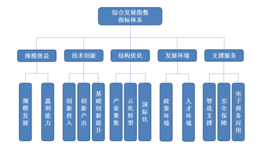2019年綜合發展指數指標體系設置5個一級指標、13個二級指標(見圖1),數據基礎以我部統計的2018年軟件和信息技術服務業統計年報數據為主。