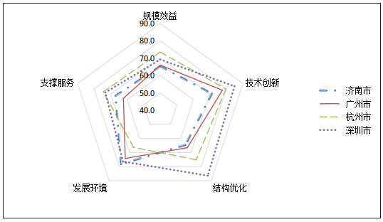 四是重點城市產業支撐服務作用顯著,發展各具特色。重點城市綜合發展指數均值69.0,其中排首位的是深圳市,綜合發展指數77.8,高出重點城市均值8.8個分值,其結構優化指數穩居首位,高于重點省市平均水平16.8個分值,以云服務為代表的信息技術服務形式演變加快,全年云化運營收入達1437.5億元,比上年增長10.7%,云化平臺快速發展成熟,在安全、金融財務等領域増勢突出。杭州市支撐服務指數最高,軟件業對智能制造的支撐能力較強,建有國家級物聯網產業示范基地,實施工廠物聯網項目236個,企業上云4萬家,工業互聯網平臺在助力企業生產效率提升方面示范作用突出。濟南市發展環境指數位居前列,高出重點城市平均水平4.6個分值,支持軟件業發展的政策體系不斷完善,把《濟南市促進先進制造業和數字經濟發展若干政策措施》作為2019年1號文件進行發布,同時出臺《大數據與新一代信息技術產業發展規劃》《濟南市新型智慧城市建設行動計劃(2018-2020年)》《濟南市關于促進工業互聯網發展的指導意見》等專項文件。