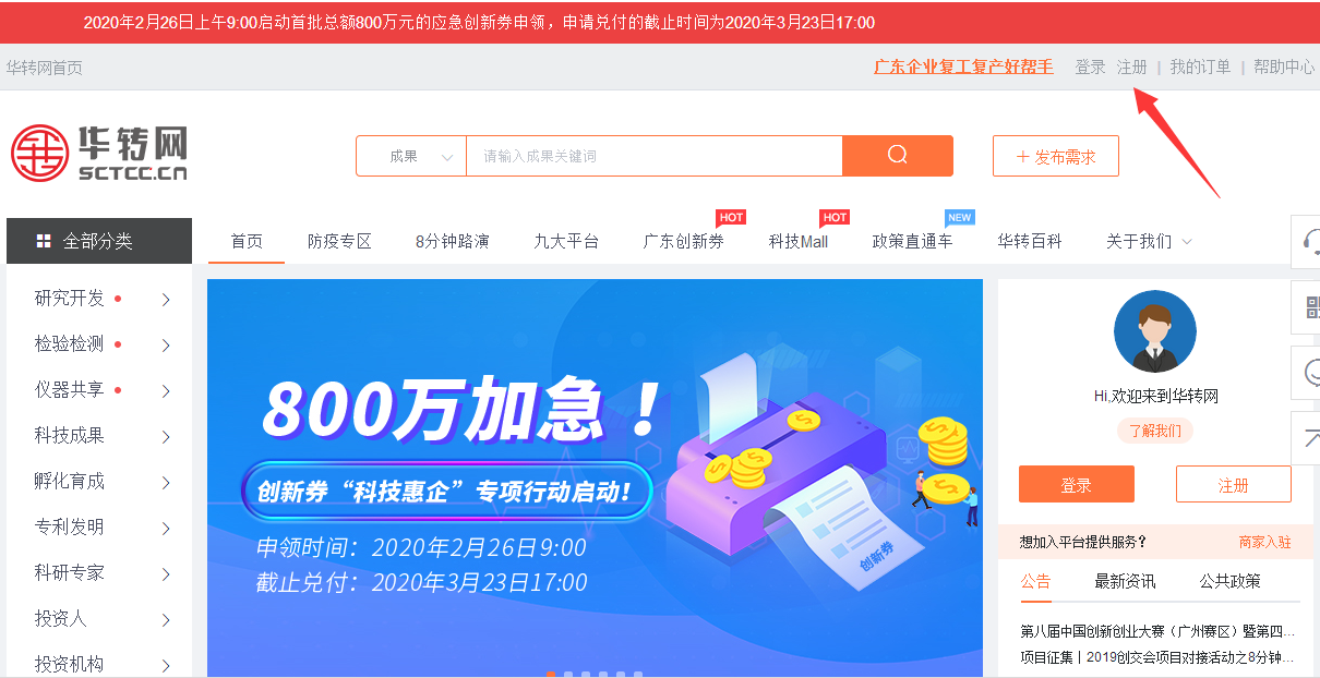 打開廣東省創(chuàng)新券工作實施的官方平臺——華轉(zhuǎn)網(wǎng)(http://www.sctcc.cn),并完成注冊步驟。