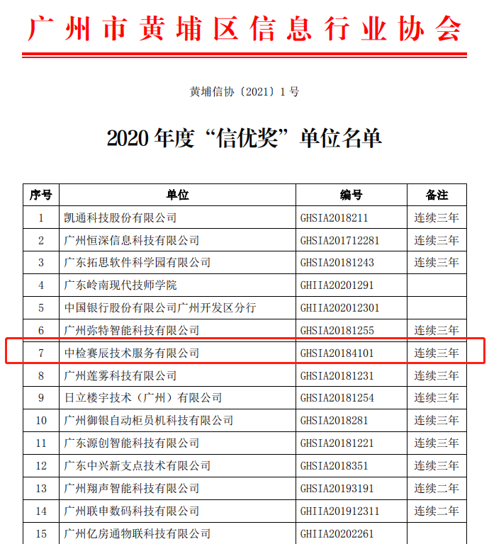 從廣州市黃埔區(qū)信息行業(yè)協(xié)會獲悉,中檢賽辰技術(shù)服務(wù)有限公司(簡稱“賽辰”)榮獲2020年度廣州市黃埔區(qū)“信優(yōu)獎”證書稱號!這是賽辰自2018年起,連續(xù)三年榮獲“信優(yōu)獎”殊榮。