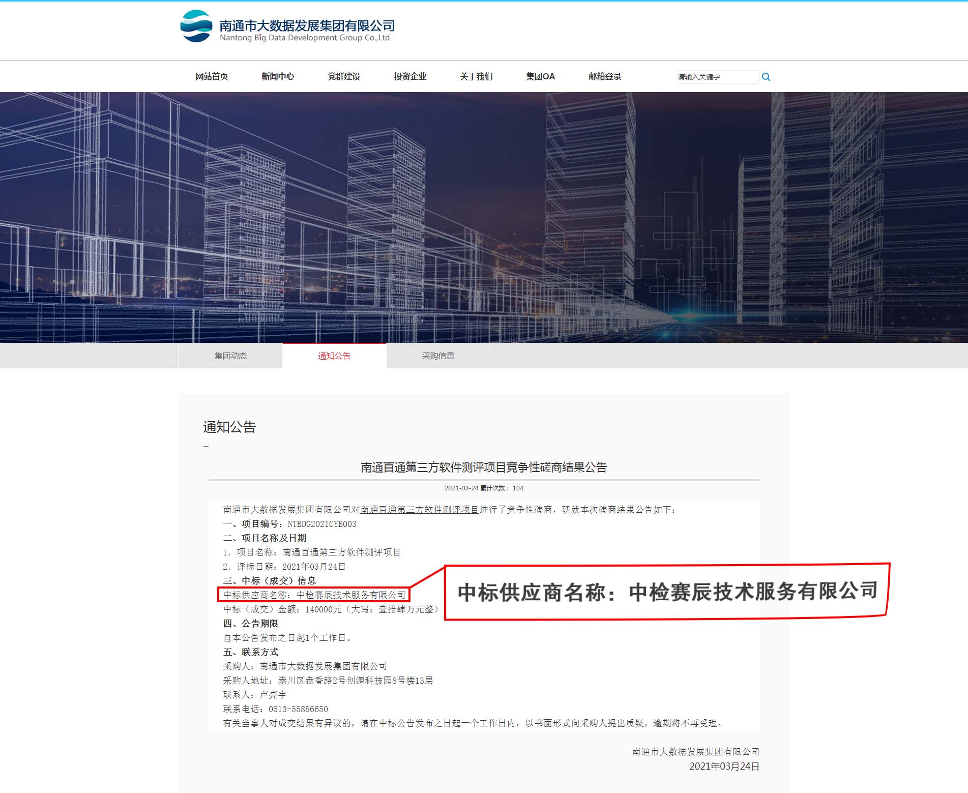 祝賀中檢賽辰技術(shù)服務(wù)有限公司(簡稱:賽辰)中標南通百通第三方軟件測評項目,中標金額:140000元。