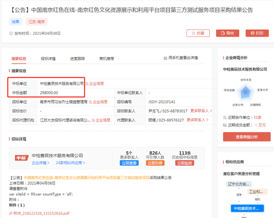 祝賀中檢賽辰技術(shù)服務(wù)有限公司(簡(jiǎn)稱“賽辰”)成功中標(biāo)中國(guó)南京紅色在線-南京紅色文化資源展示和利用平臺(tái)項(xiàng)目第三方測(cè)試服務(wù)項(xiàng)目,中標(biāo)金額:298000元!