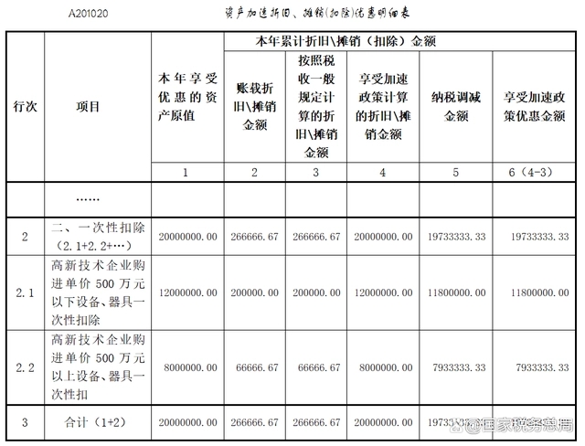 第一步,先填報一次性扣除情況。對于單價500萬元以下設(shè)備、器具,在《資產(chǎn)加速折舊、攤銷(扣除)優(yōu)惠明細表》(A201020)第2行“二、一次性扣除”下的明細行次中填寫“高新技術(shù)企業(yè)購進單價500萬元以下設(shè)備、器具一次性扣除”事項及“本年享受優(yōu)惠的資產(chǎn)原值”等信息;對于單價500萬元以上設(shè)備、器具,填寫“高新技術(shù)企業(yè)購進單價500萬元以上設(shè)備、器具一次性扣除”事項及“本年享受優(yōu)惠的資產(chǎn)原值”等信息。填寫完畢后,將該表單中“納稅調(diào)減金額”列次的合計值(第3行第5列)填寫在《中華人民共和國企業(yè)所得稅月(季)度預(yù)繳納稅申報表(A類)》(A202000)第6行“資產(chǎn)加速折舊、攤銷(扣除)調(diào)減額(填寫A201020)”中。