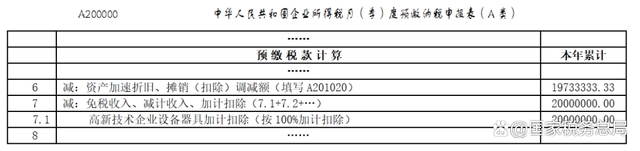 第二步:在《中華人民共和國企業(yè)所得稅月(季)度預(yù)繳納稅申報表(A類)》(A200000)第7行“減:免稅收入、減計收入、加計扣除”下的明細行次填報加計扣除情況。手工申報的,在明細行次填寫“高新技術(shù)企業(yè)設(shè)備、器具加計扣除(按100%加計扣除)”事項及加計扣除金額。通過電子稅務(wù)局申報的,申報系統(tǒng)自動填報相關(guān)事項及加計扣除金額。
